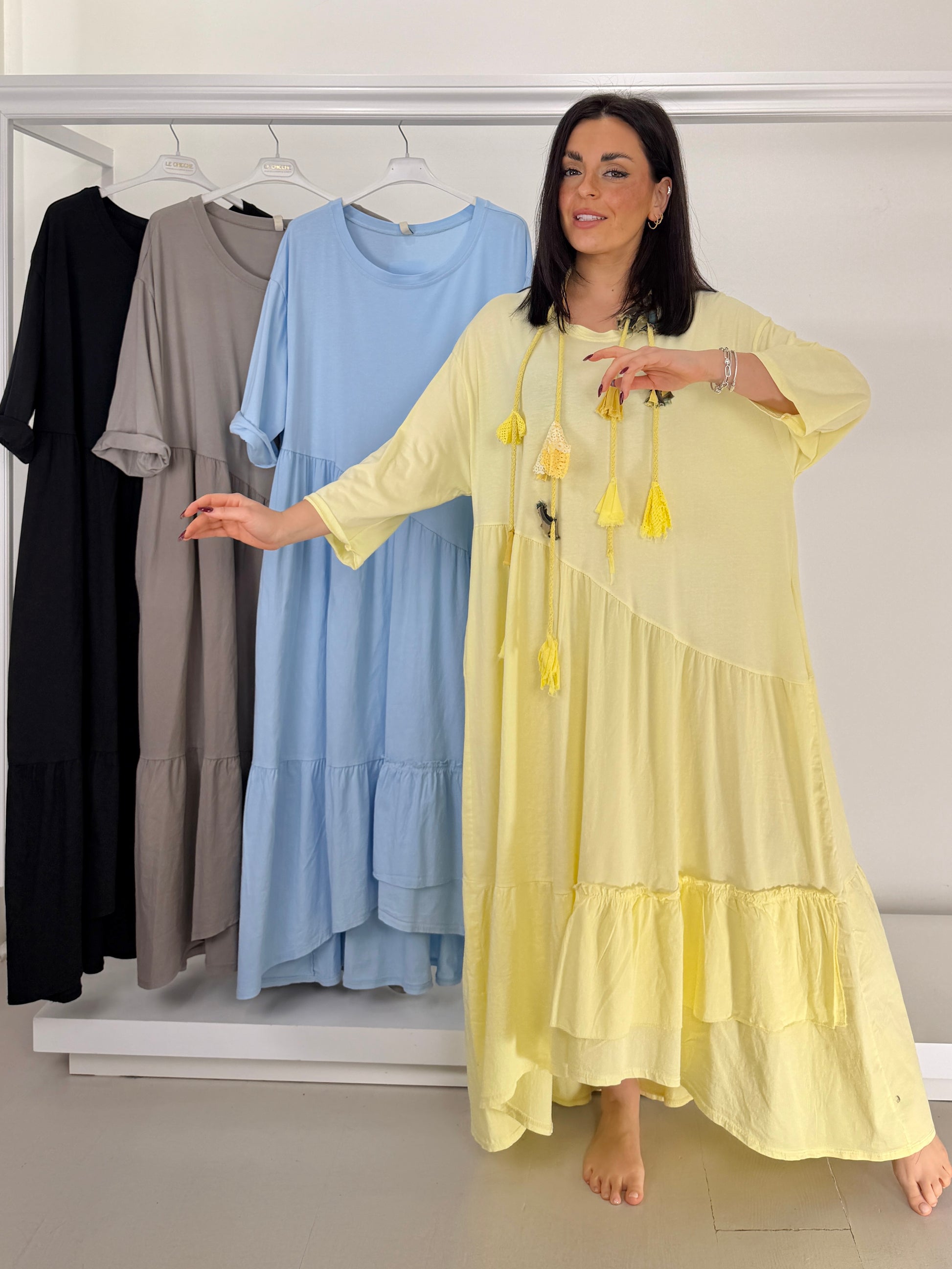 Abito due tessuti con balze