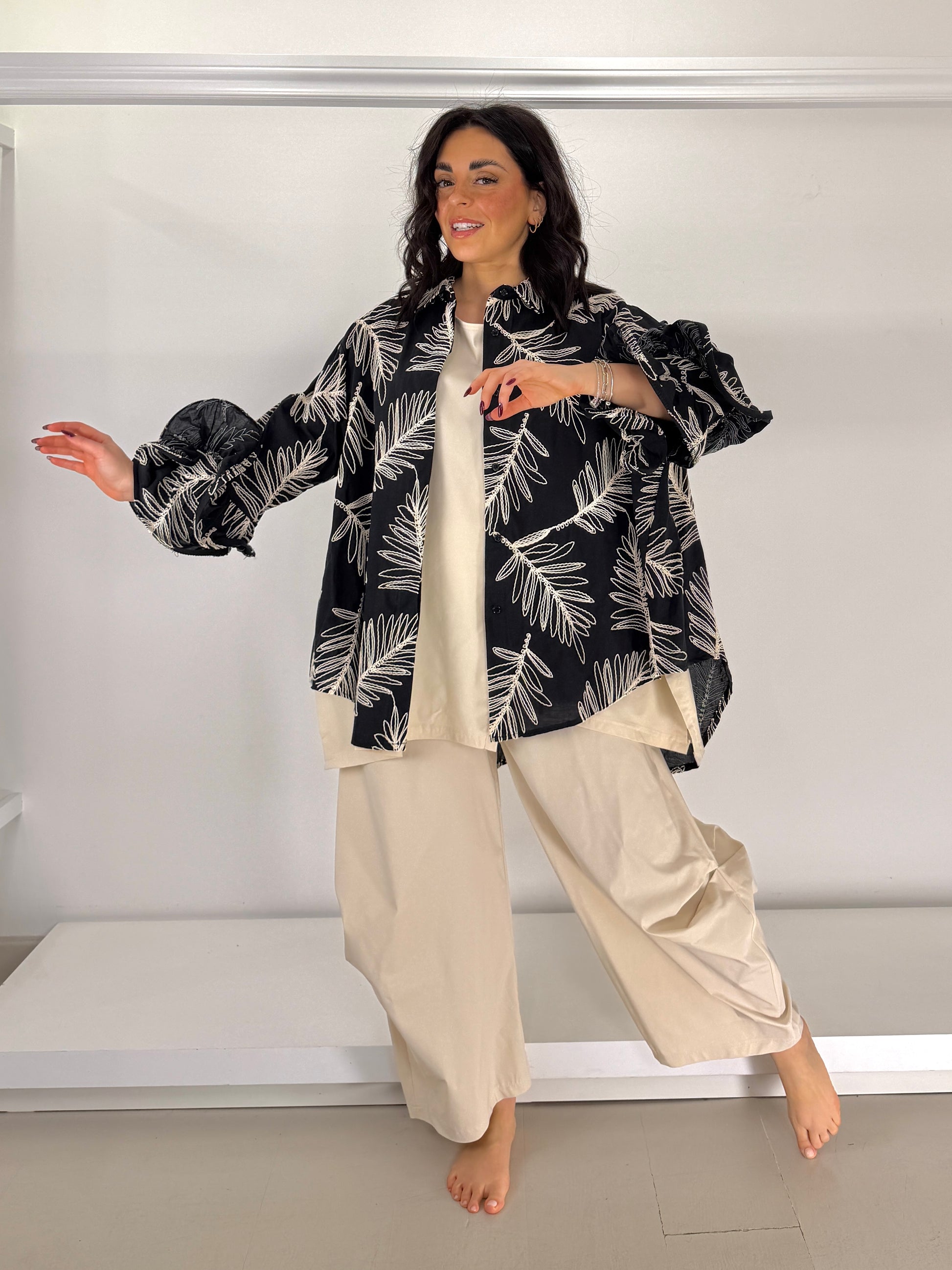 Camicia ricamo foglie manica volant