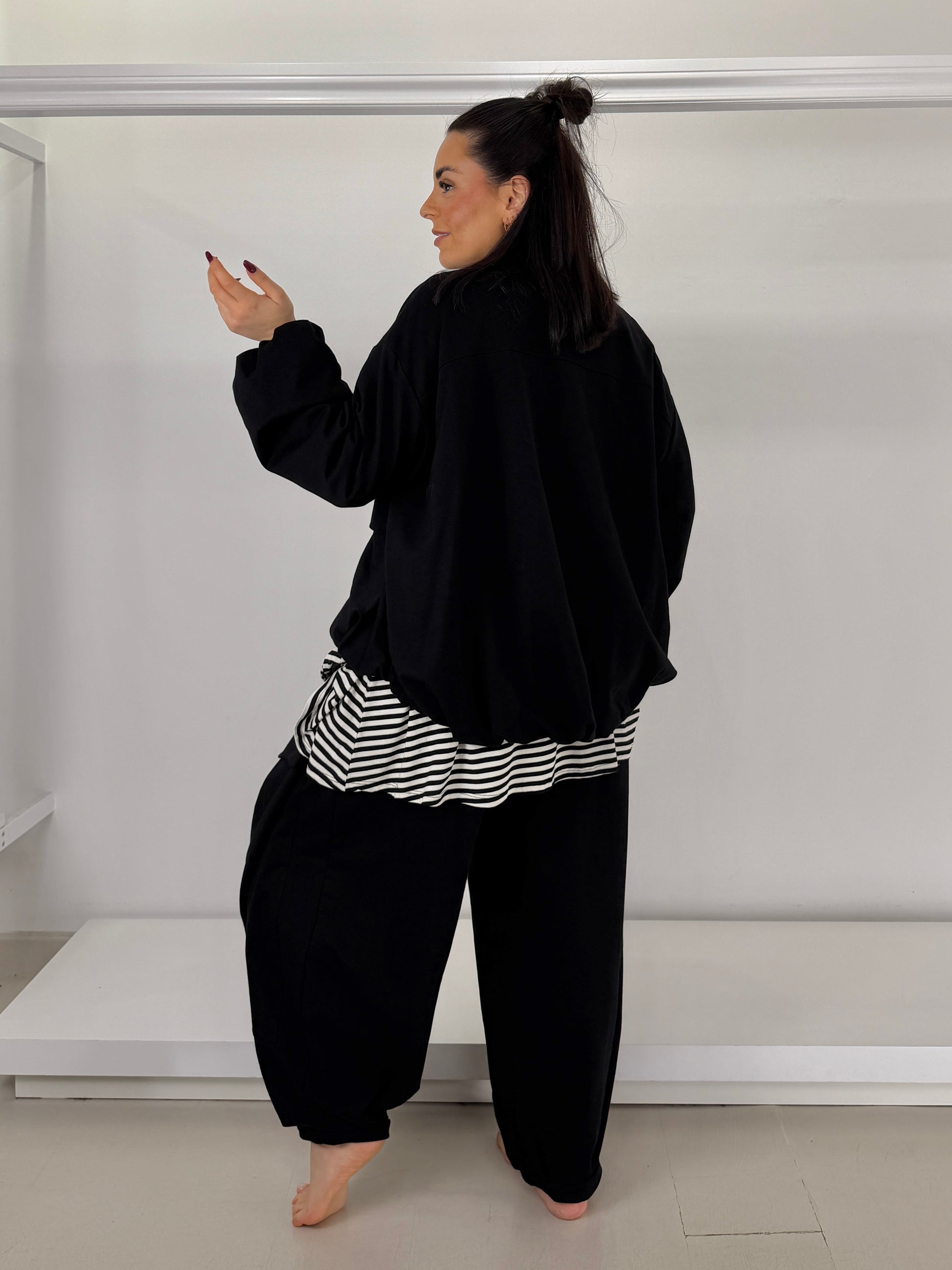 Taglia unica: seno 140 cm, fianchi 130 cm, estensione elastico in fondo fino a 160 cm, lunghezza 60 cm