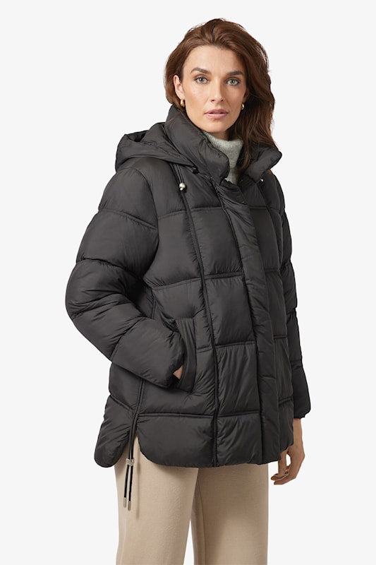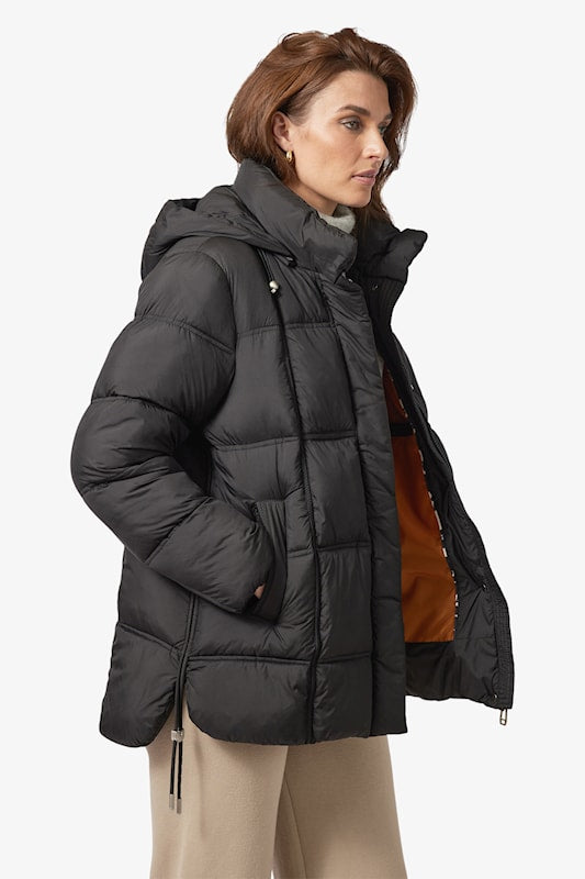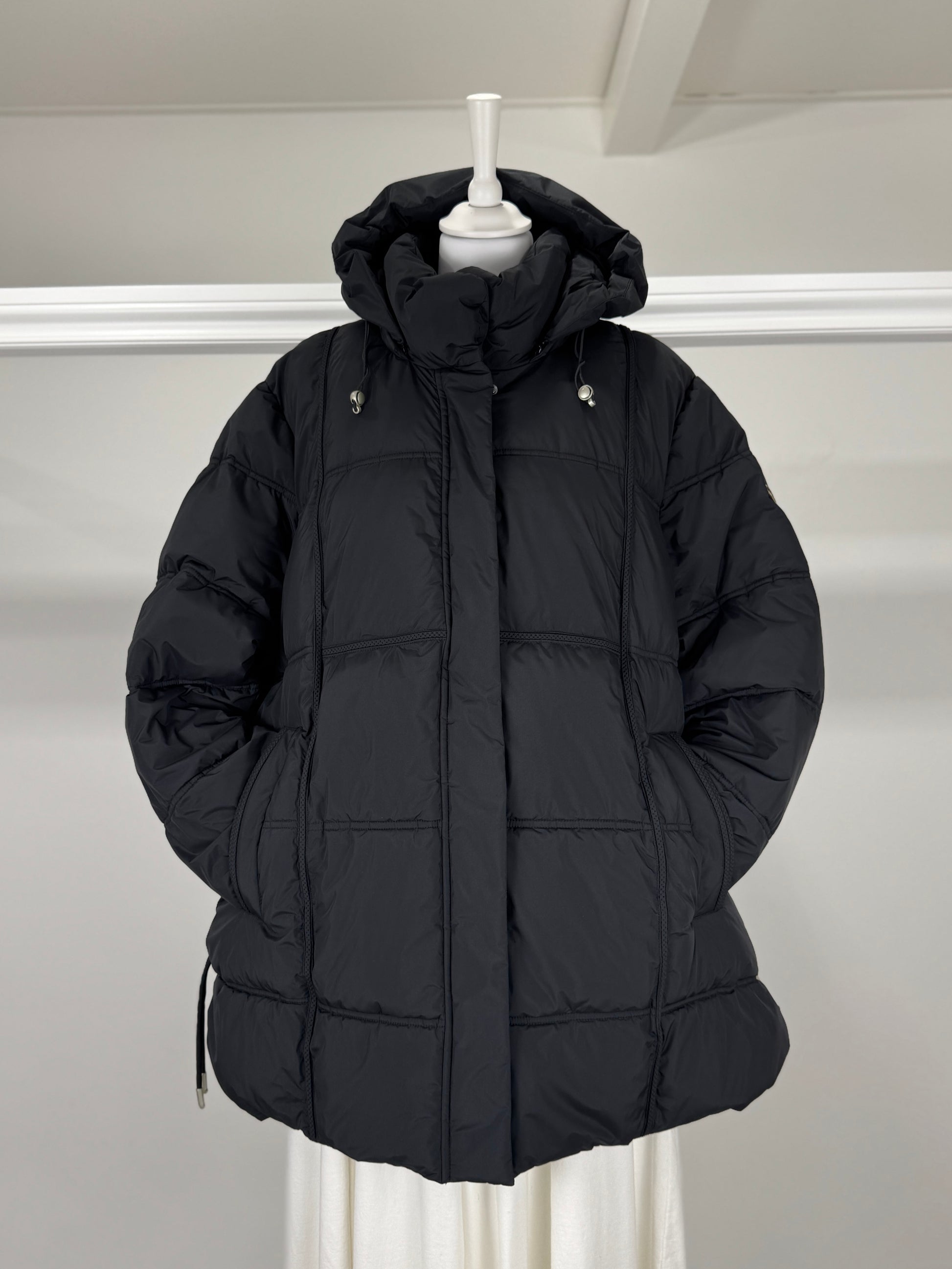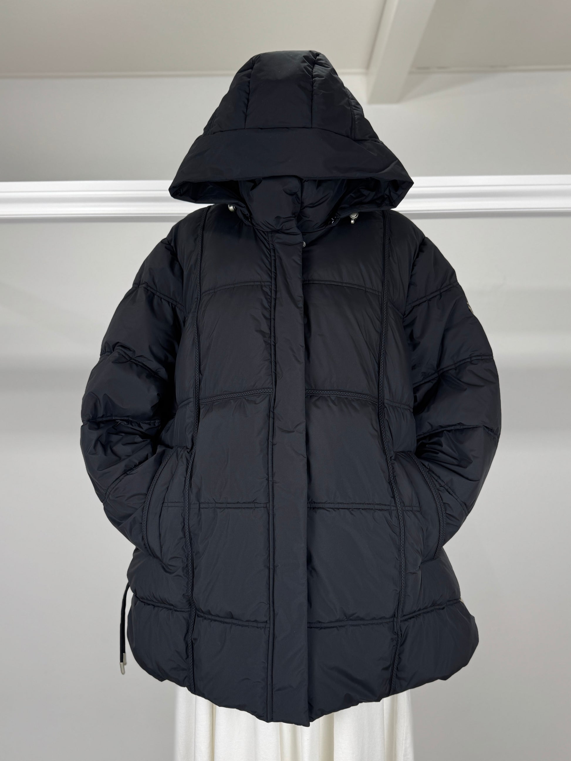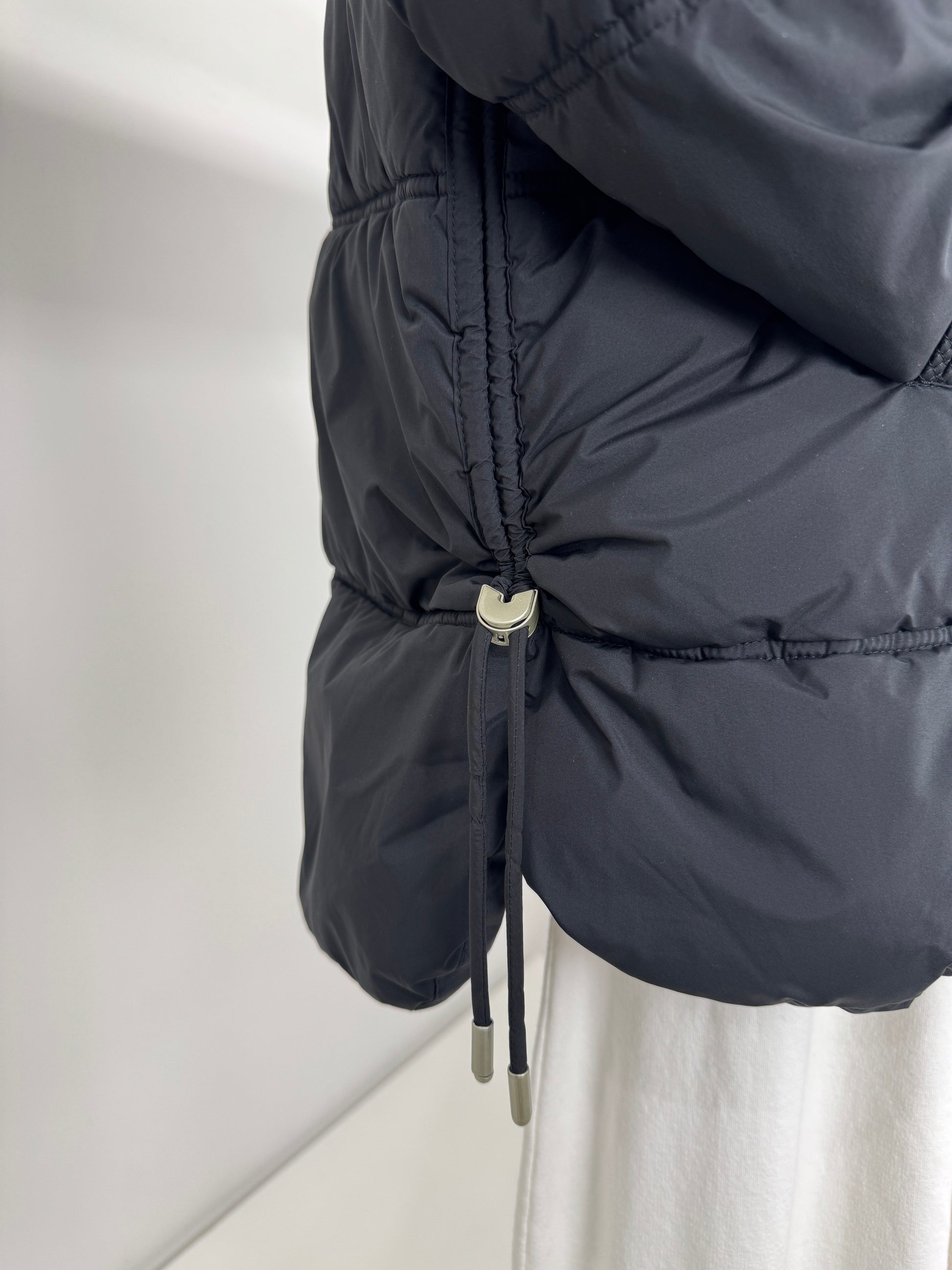 Piumino con doppia chiusura: cerniera e bottoni automatici. Coulisse anche sul cappuccio, il quale è anche rimovibile. Etichetta con certificato impermeabile.